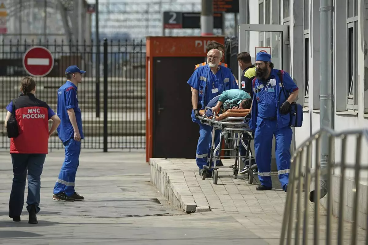 Emergency medics transport a wounded passenger at the railway station in Moscow, Russia, Sunday, June 1, 2025, after a road bridge collapsed on top of a passenger train in the Bryansk region, located on Russia's border with Ukraine. (AP Photo)