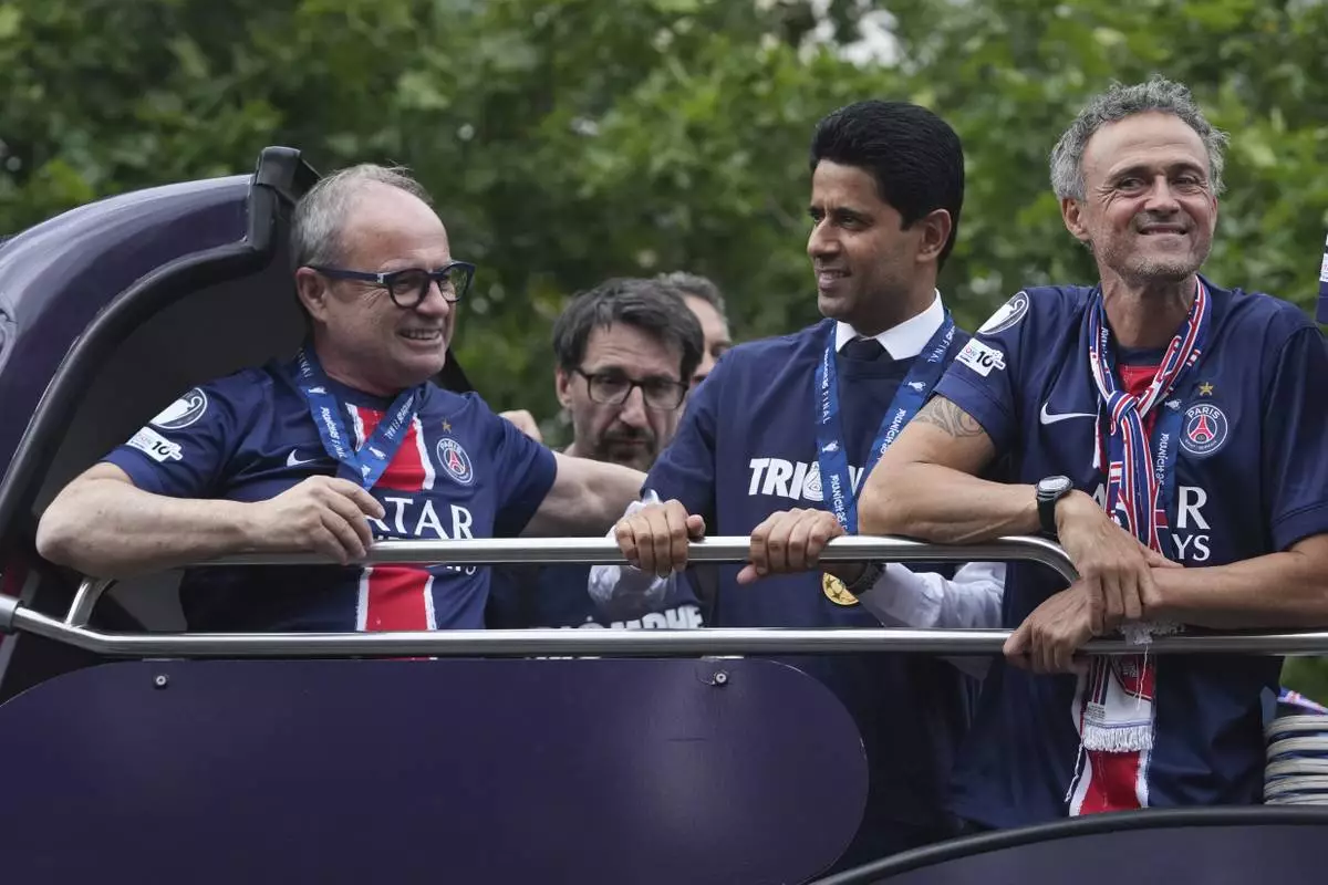 PSG's head coach Luis Enrique, right, and PSG owner Nasser bin Ghanim Al-Khelaifi, center, attend a parade on the Champs-Elysees avenue after the team won the Champions League final soccer match between Paris Saint-Germain and Inter Milan Sunday, June 1, 2025 in Paris. (AP Photo/Thibault Camus)