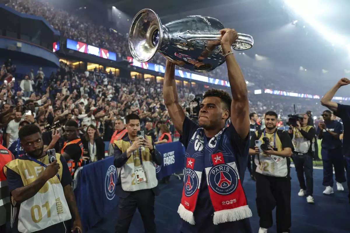 Paris Saint-Germain's midfielder Desire Doue celebrates with supporters during a ceremony to present the trophy a day after Paris Saint-Germain (PSG) won the UEFA Champions League, at the Parc des Princes Stadium in Paris Sunday, June 1, 2025. (Franck Fife, Pool via AP)