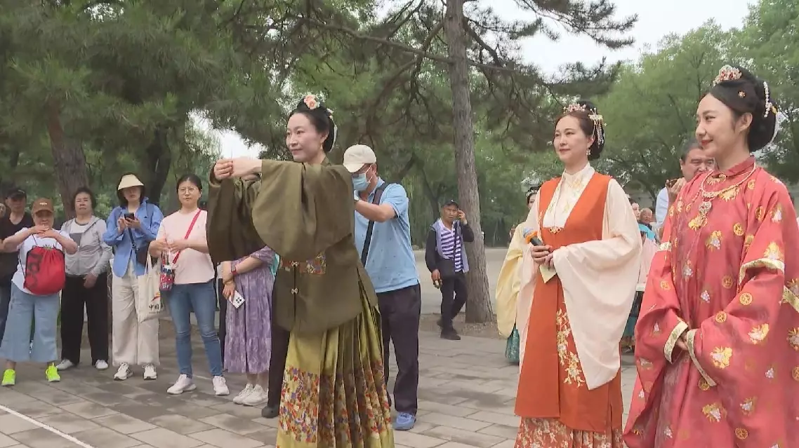 The Yuyuantan Park in Beijing held a fair of intangible cultural heritage objects for the holiday. Day 1 of the holiday saw the fair bustling with visitors. One of the highlights was a Hanfu etiquette demonstration that captured the attention of many tourists. Park workers, dressed in Hanfu, the traditional costumes of the Han Chinese people, taught visitors to perform traditional Chinese ceremonial gestures.