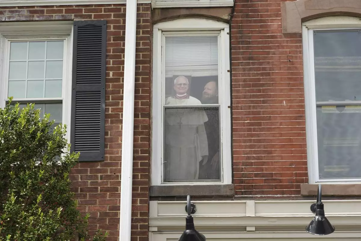 The Rev. Zachary Swantek, Princeton’s Catholic chaplain, stands for a portrait next to a cardboard image of Pope Leo XIV on display on a window at the Aquinas Institute, the university’s Catholic campus ministry, in Princeton, N.J., on Thursday, May 15, 2025. (AP Photo/Luis Andres Henao)