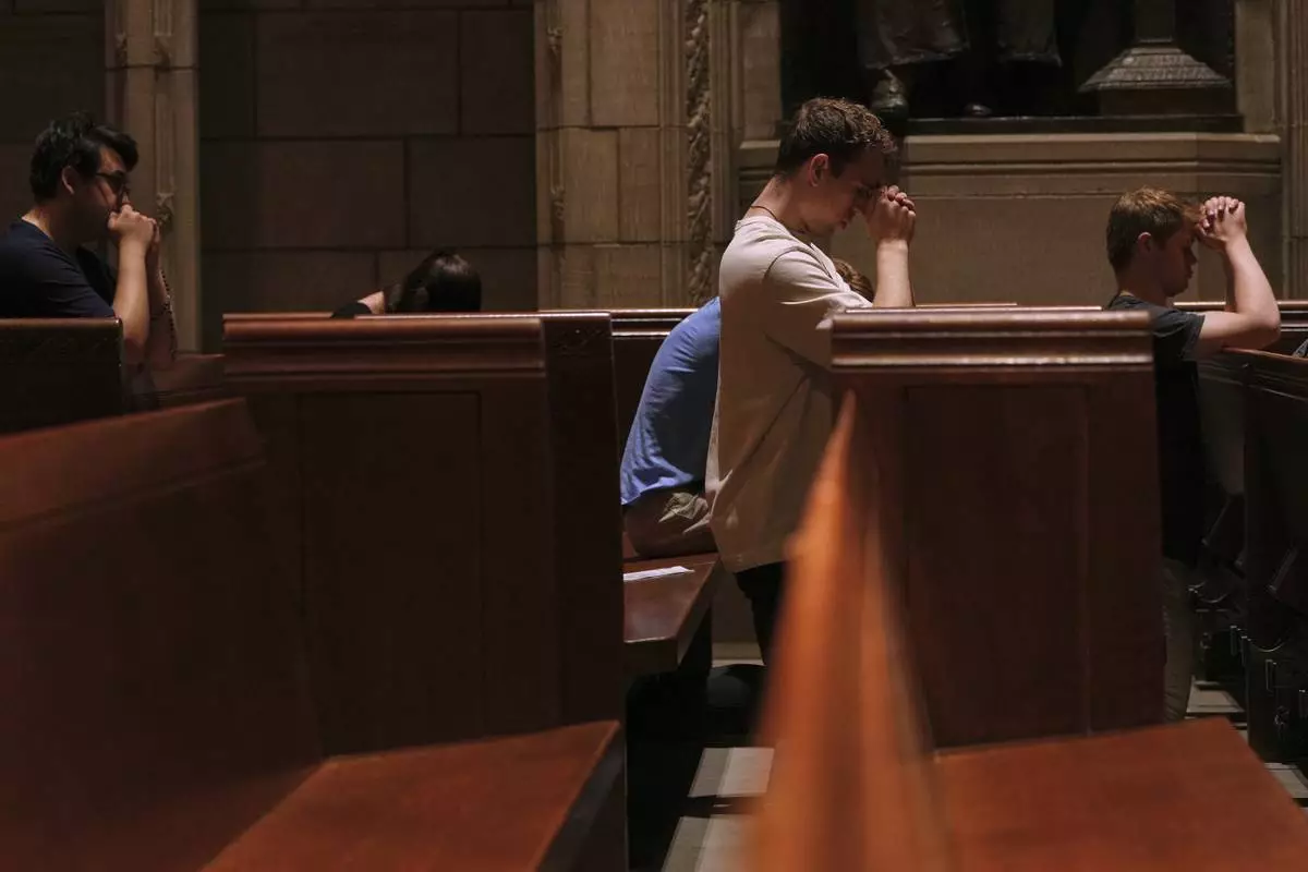 Eric Anderson, center, an associate campus minister at Princeton University prays with others, including Logan Nelson, right, a fellow member of the university’s Catholic campus ministry, after a Mass on Friday, May 16, 2025. (AP Photo/Luis Andres Henao)