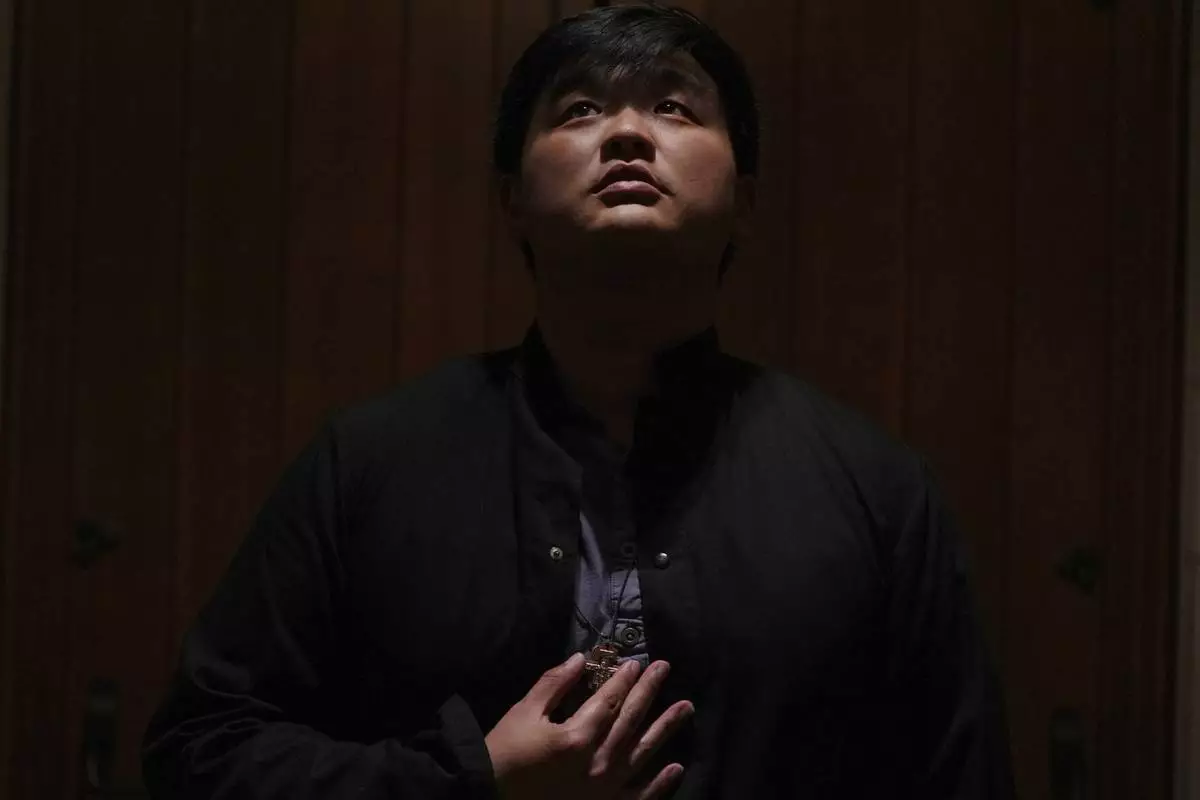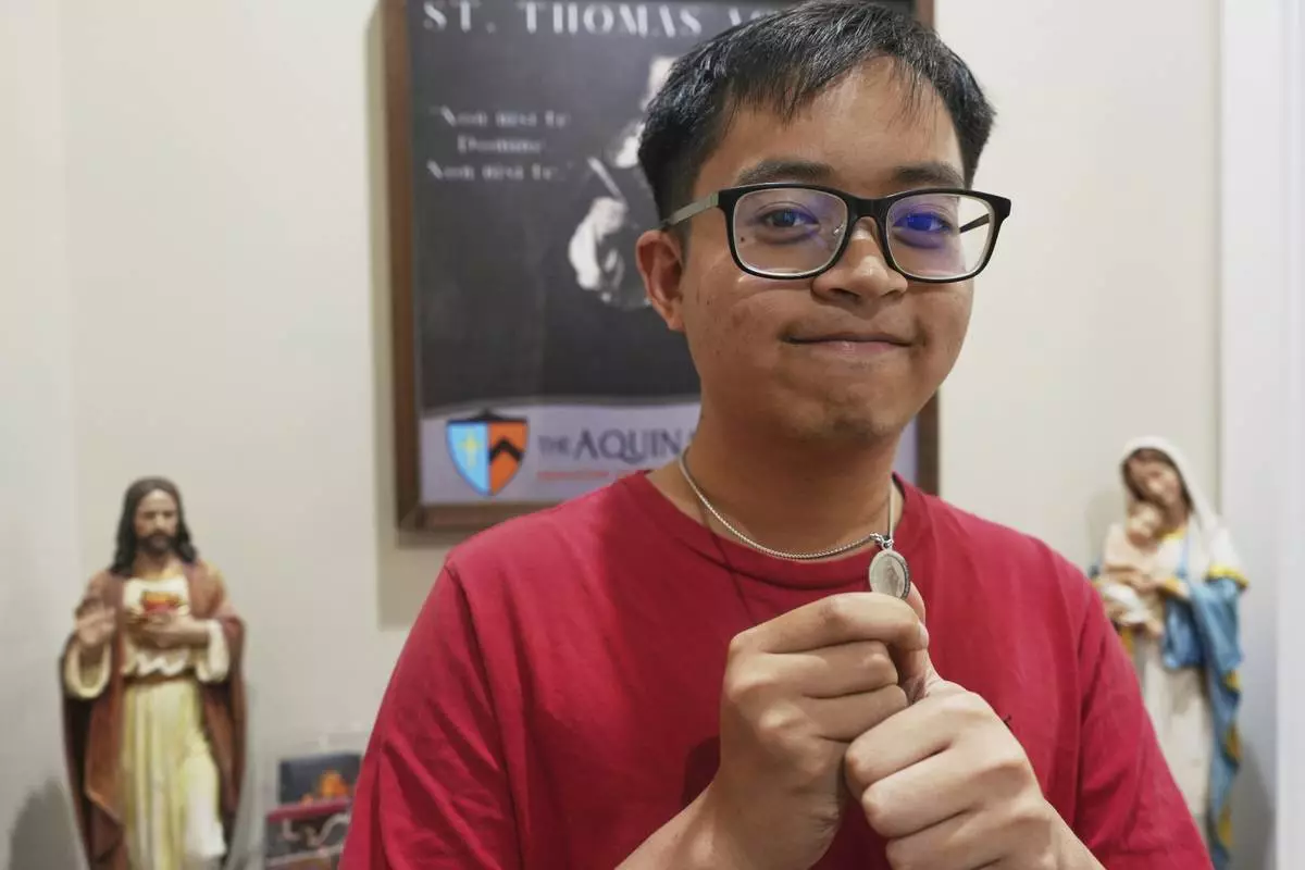 David Kim, a Catholic altar server, stands for a portrait before a Mass at the Princeton University chapel in Princeton, N.J., on Friday, May 16, 2025. (AP Photo/Luis Andres Henao)