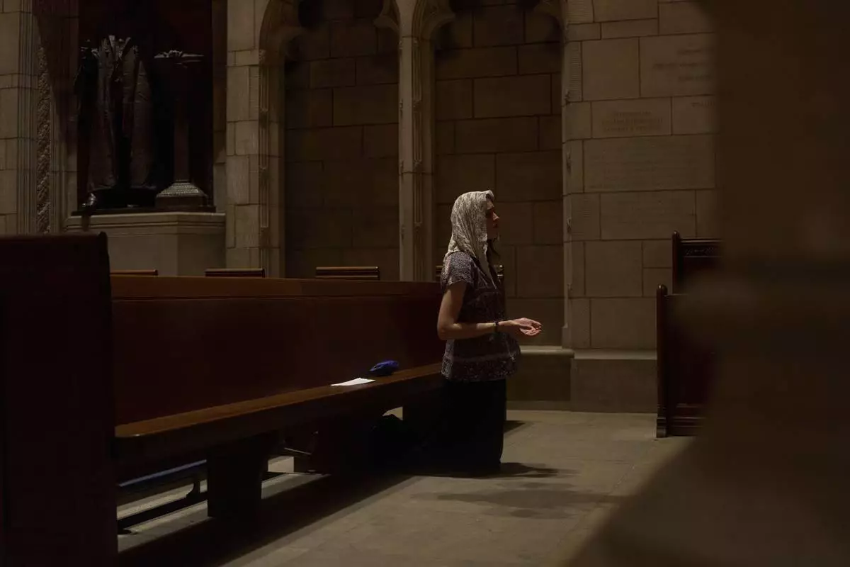 Savannah Nichols, visiting her boyfriend, altar server David Kim, from Ohio, prays after a service at the Princeton University chapel in Princeton, N.J., on Friday, May 16, 2025. (AP Photo/Luis Andres Henao)