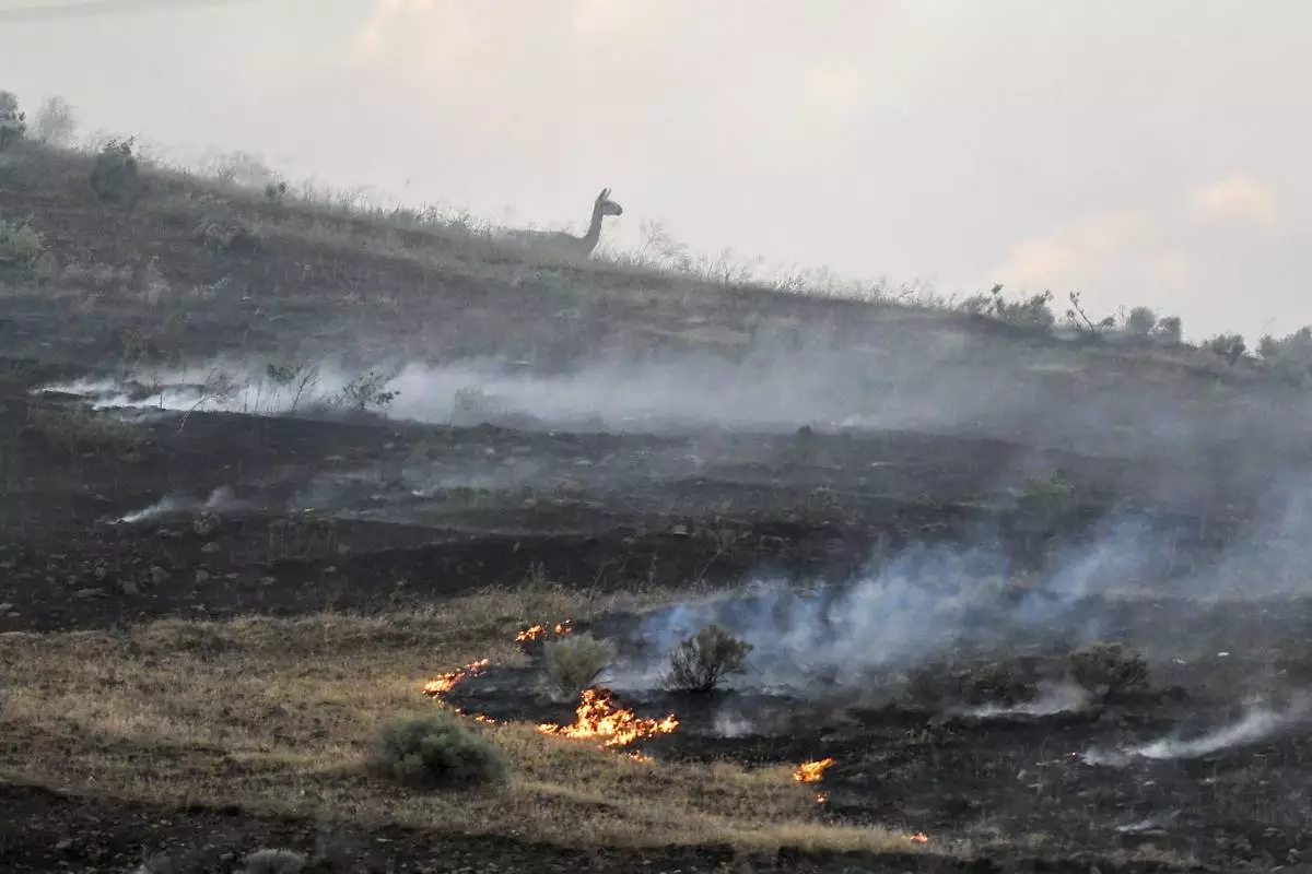 A lama is seen on a hillside as a fire burns along Hatwai road Saturday, May 31, 2025, in north Lewiston, Idaho. (August Frank/Lewiston Tribune via AP)