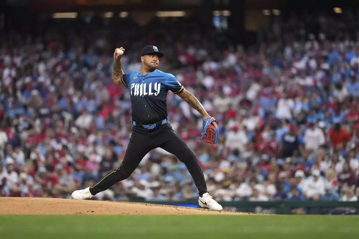 Philadelphia Phillies' Taijuan Walker pitches during the second inning of a baseball game against the Milwaukee Brewers Friday, May 30, 2025, in Philadelphia. (AP Photo/Matt Slocum)