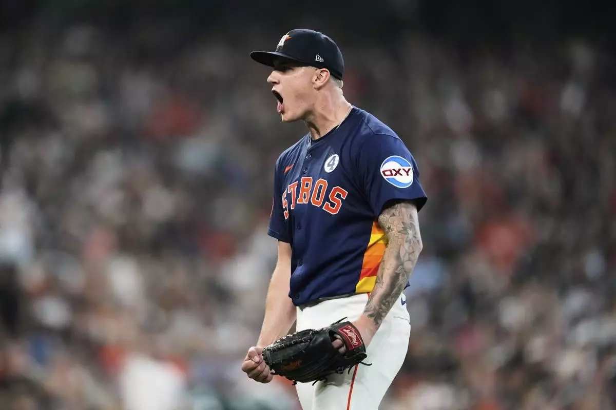 Houston Astros starting pitcher Hunter Brown reacts after Tampa Bay Rays designated hitter Yandy Diaz grounds out during the sixth inning of a baseball game in Houston, Sunday, June 1, 2025. (AP Photo/Ashley Landis)