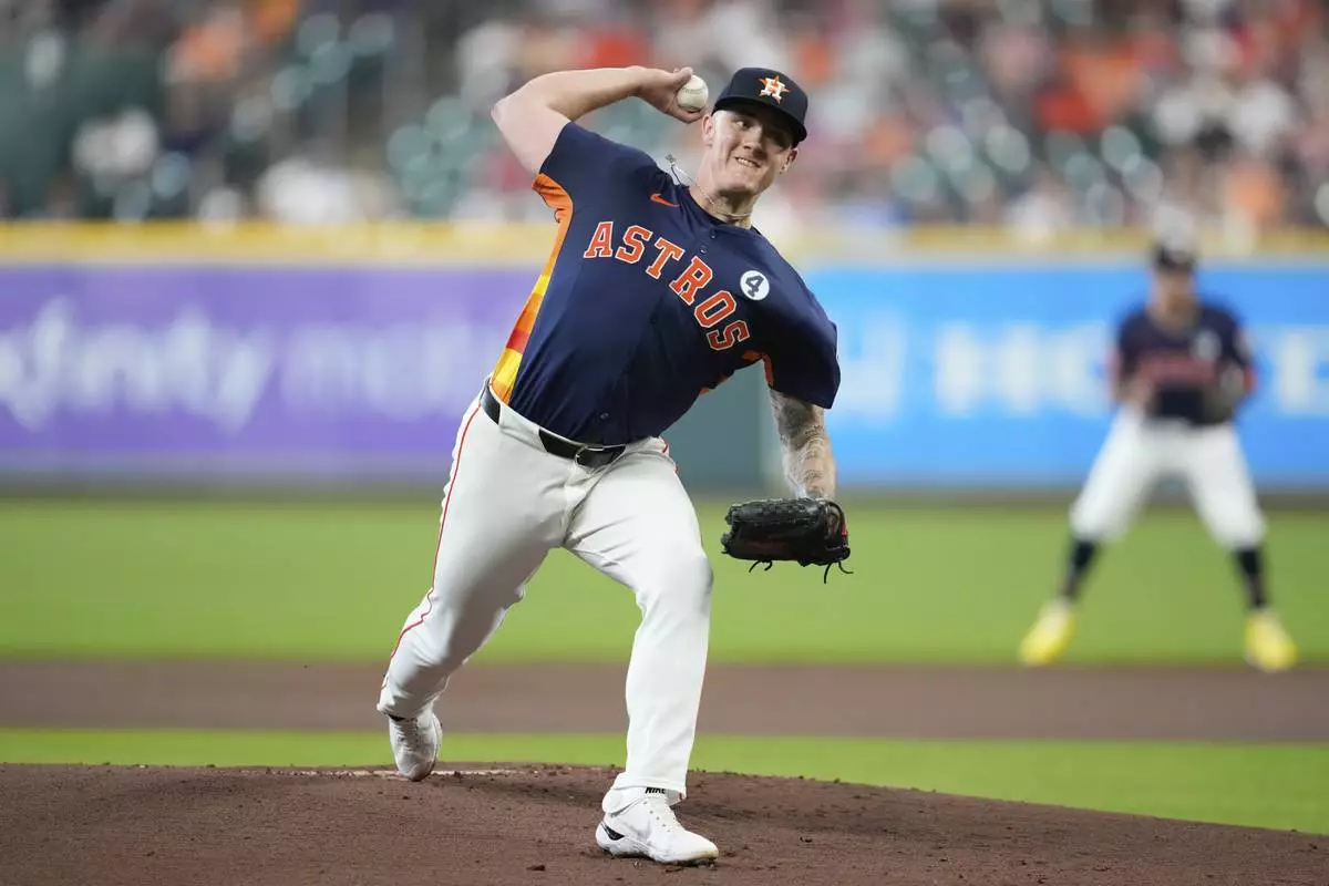 Houston Astros starting pitcher Hunter Brown throws during the first inning of a baseball game against the Tampa Bay Rays in Houston, Sunday, June 1, 2025. (AP Photo/Ashley Landis)