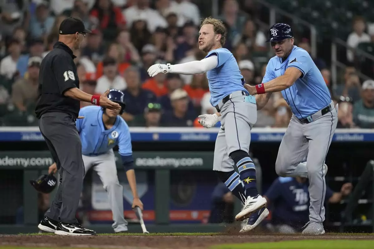 Tampa Bay Rays' Taylor Walls, center, is held back after he's ejected by Umpire Nic Lentz, left, for tapping his helmet after a strike call during the ninth inning of a baseball game against the Houston Astros in Houston, Sunday, June 1, 2025. (AP Photo/Ashley Landis)