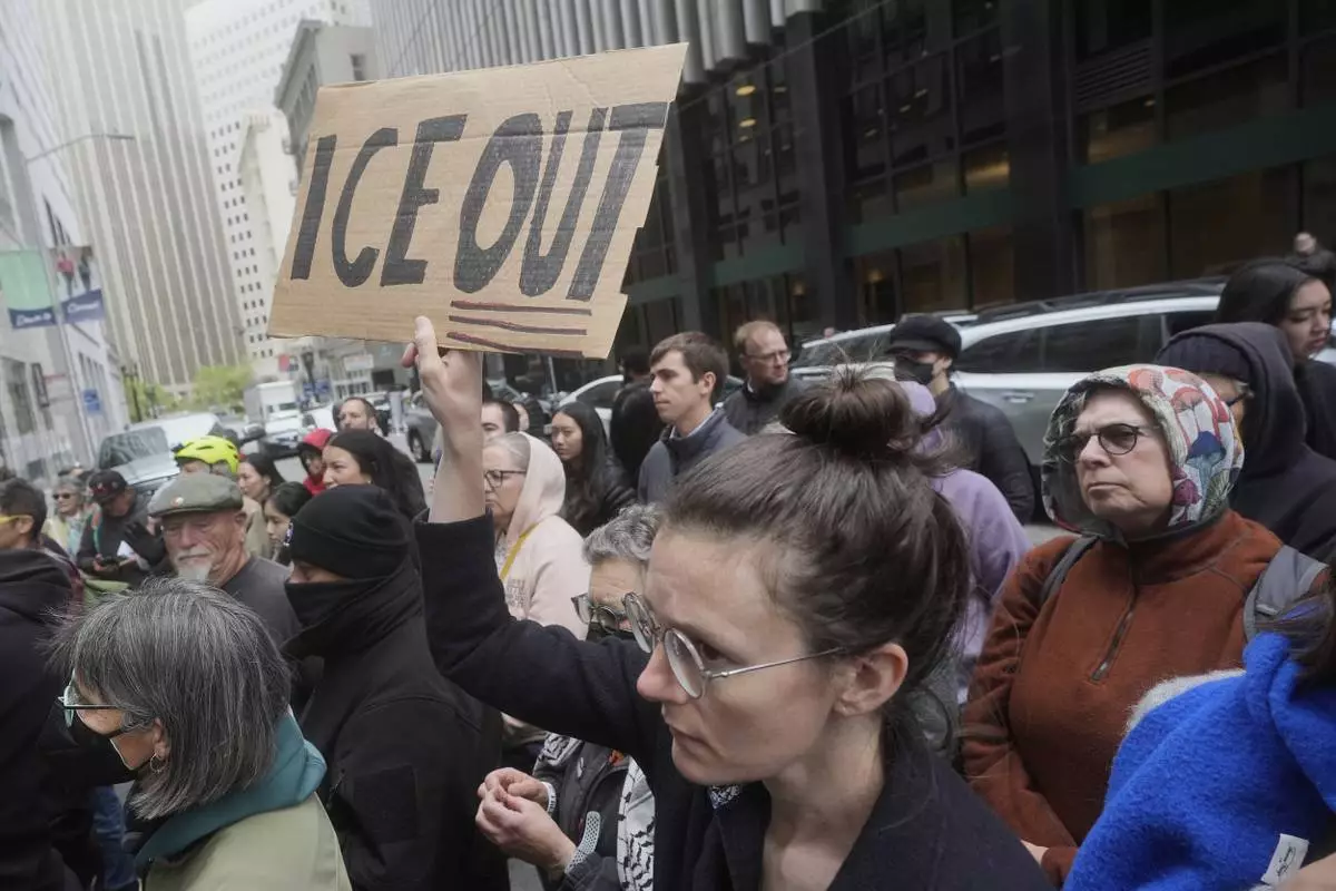 FILE - A person holds up a sign during a news conference and rally by immigrant justice organizations and advocates protesting ICE arrests in San Francisco, Wednesday, May 28, 2025. (AP Photo/Jeff Chiu, File)
