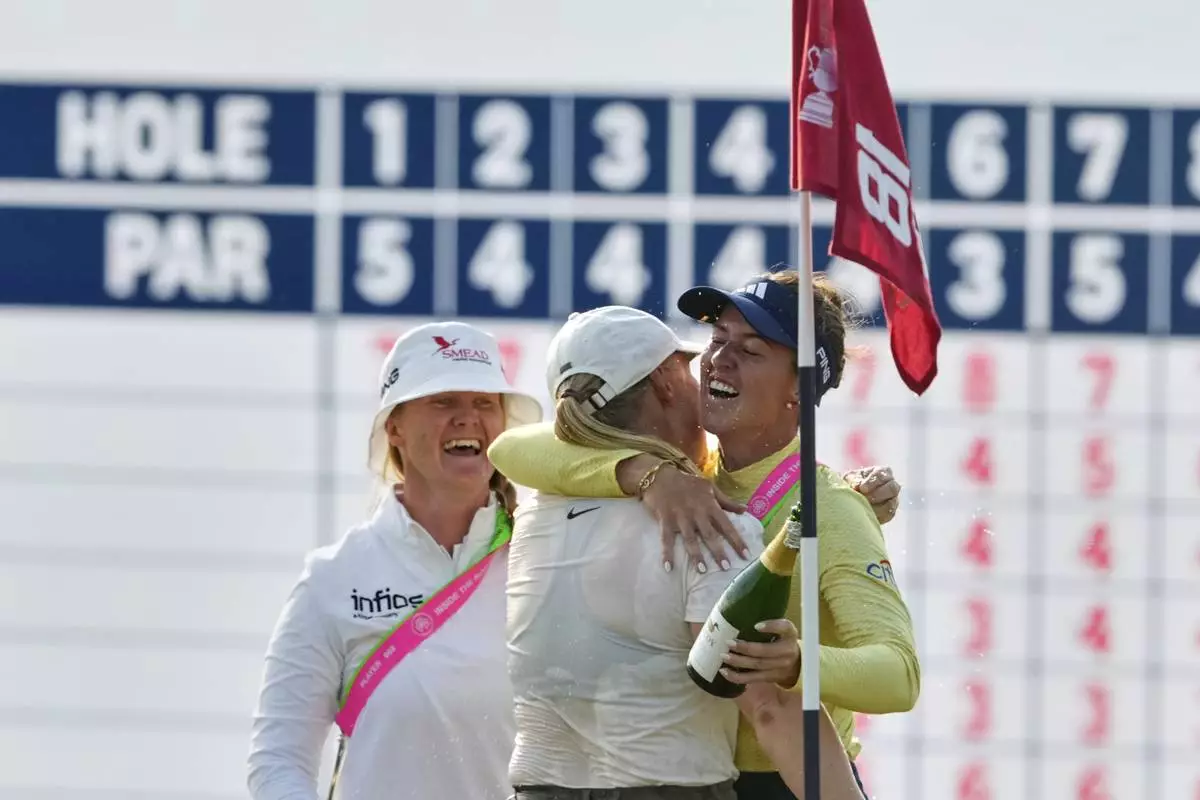 Maja Stark, of Sweden, celebrates with Linn Grant, of Sweden, after winning the U.S. Women's Open golf tournament at Erin Hills Sunday, June 1, 2025, in Erin, Wis. (AP Photo/Matt York)