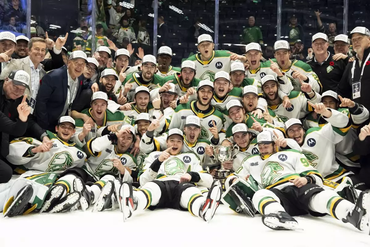 London Knights players and staff pose for a team photo after the team defeated the Medicine Hat Tigers in the Memorial Cup hockey final in Rimouski, Quebec, Sunday, June 1, 2025. (Christopher Katsarov/The Canadian Press via AP)