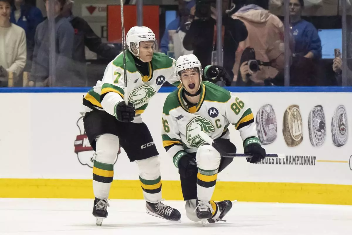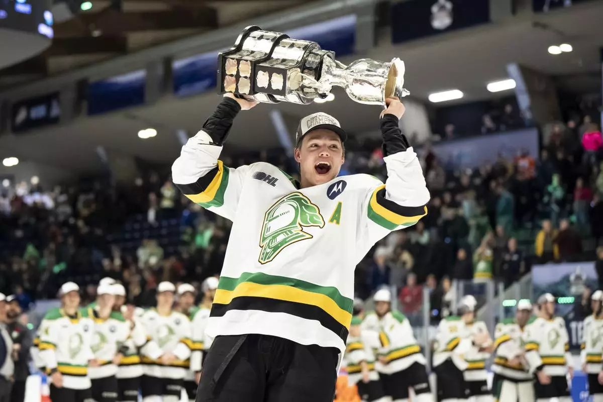 London Knights' Easton Cowan (7) celebrates with teammates after the London Knights defeated the Medicine Hat Tigers 4-1 in Memorial Cup hockey finals, in Rimouski, Que., on Sunday, June 1, 2025. (Christopher Katsarov/The Canadian Press via AP)