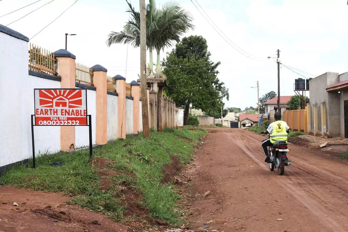 A person rides past a sign for EarthEnable on May 17, 2025, in Jinja, Uganda. (AP Photo/Hajarah Nalwadda)