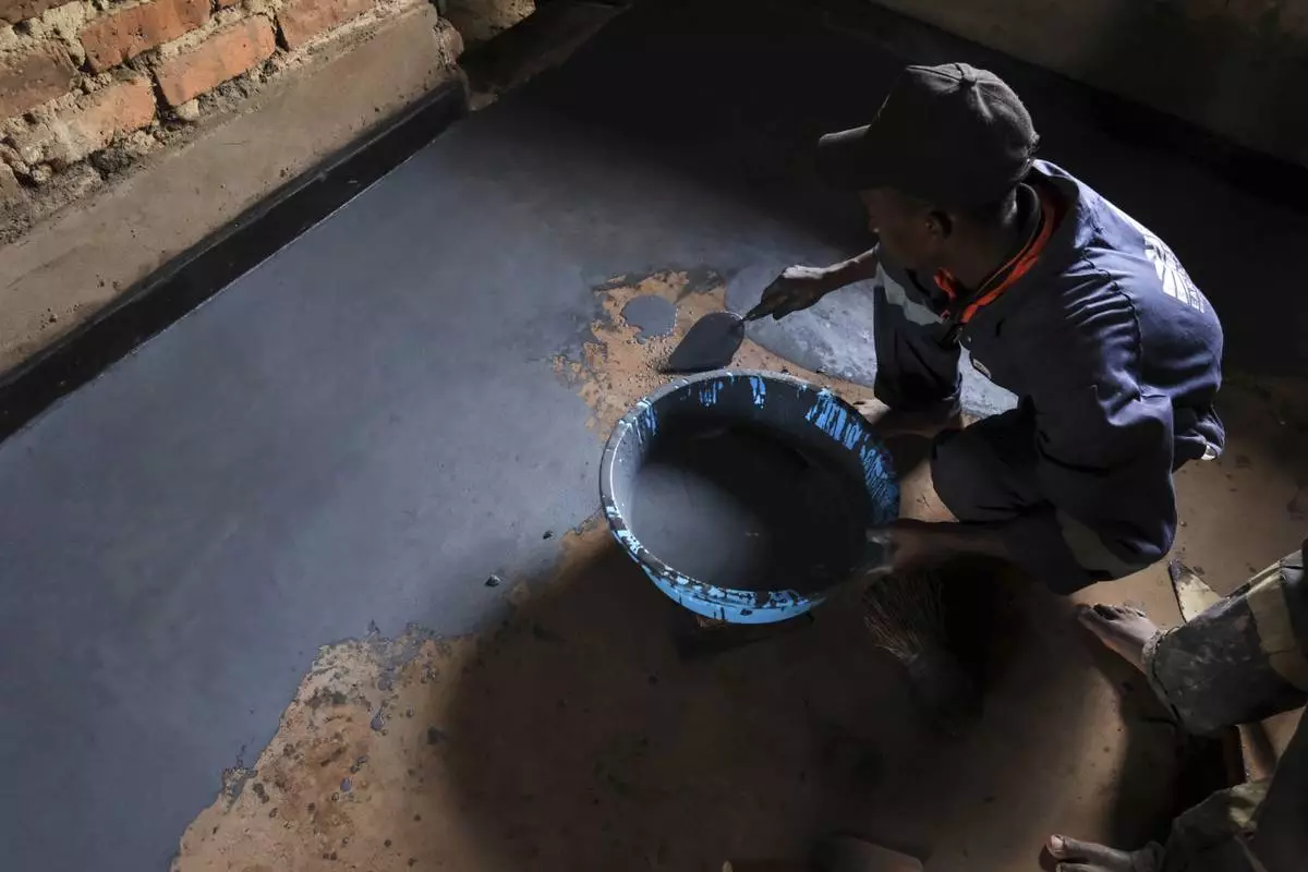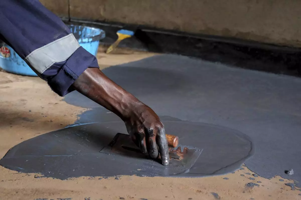 Alex Wanda, a construction officer at EarthEnable, installs paste on floors May 17, 2025, in Jinja, Uganda. (AP Photo/Hajarah Nalwadda)