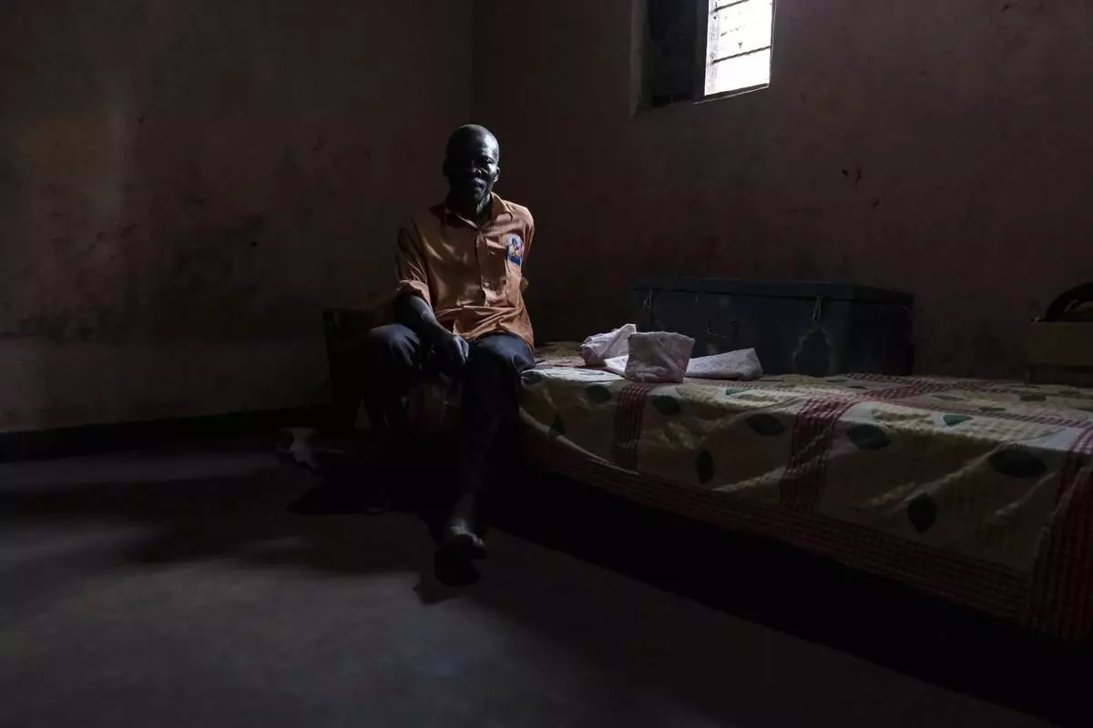 Simon Tigawalana sits on a bed as he rests his feet on a clay-based earthen floor made by EarthEnable at home on May 16, 2025, in Jinja, Uganda. (AP Photo/Hajarah Nalwadda)