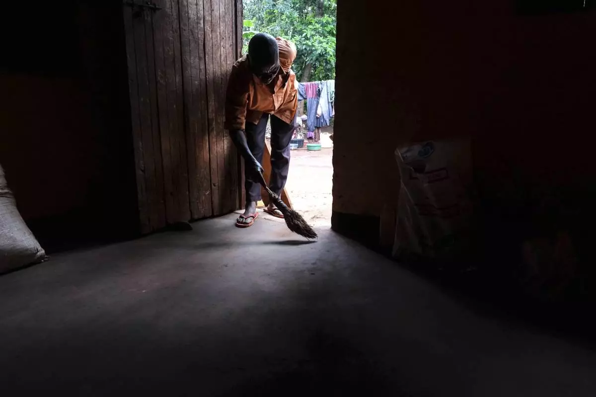 Simon Tigawalana sweeps his house with a clay-based earthen floor by EarthEnable on May 16, 2025, in Jinja, Uganda. (AP Photo/Hajarah Nalwadda)
