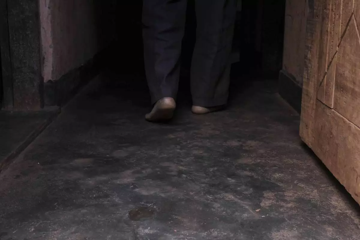 Simon Tigawalana walks into his house with some clay-based earthen floors by EarthEnable on May 16, 2025, in Jinja, Uganda. (AP Photo/Hajarah Nalwadda)