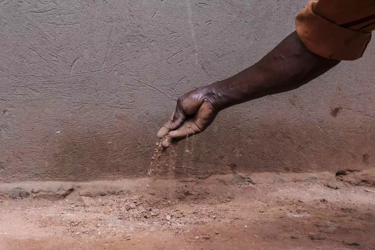 Simon Tigawalana shows dirt, that used to make up his home’s floor, before getting a clay-based earthen floor by a company called EarthEnable on May 16, 2025, in Jinja, Uganda. (AP Photo/Hajarah Nalwadda)