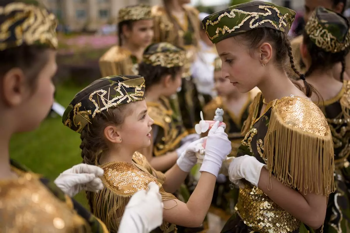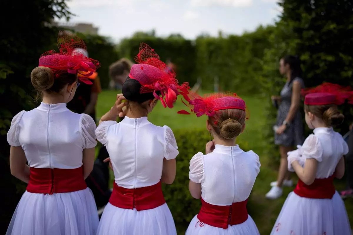 Students of a dance school check their outfits outside Romania's Palace of Parliament during a series of events marking International Children's Day in Bucharest, Romania, Sunday, June 1, 2025. (AP Photo/Andreea Alexandru)