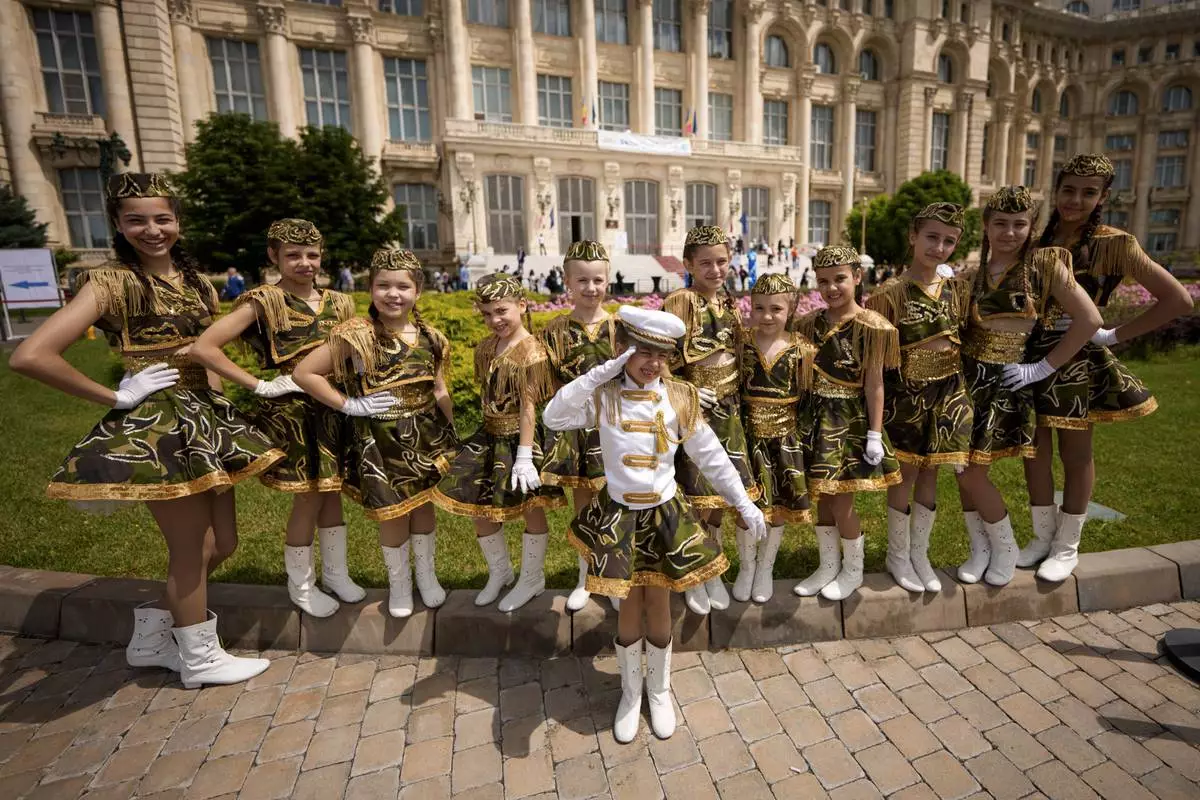 Students of a dance school strike a pose outside Romania's Palace of Parliament during a series of events marking International Children's Day in Bucharest, Romania, Sunday, June 1, 2025. (AP Photo/Andreea Alexandru)