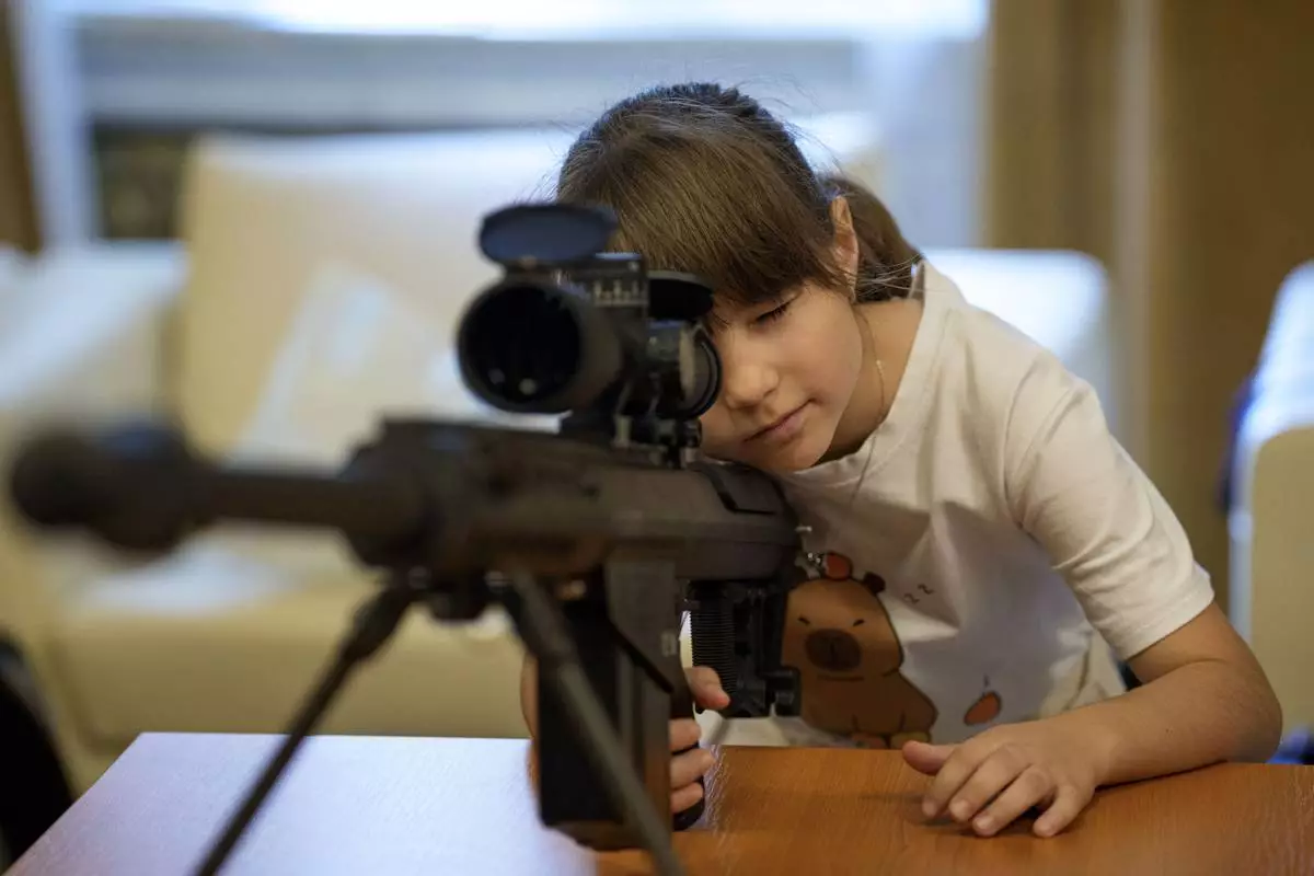 A girl looks through the scope of a military firearm at an exhibition inside Romania's Palace of Parliament during a series of events marking International Children's Day in Bucharest, Romania, Sunday, June 1, 2025. (AP Photo/Andreea Alexandru)