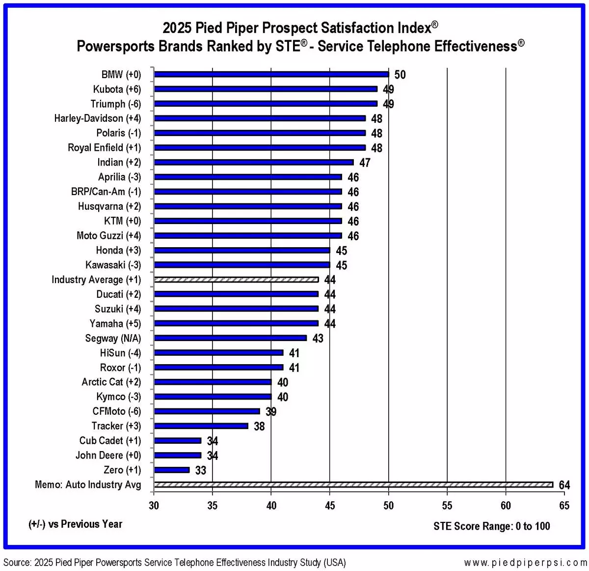 BMW Motorrad dealerships ranked highest in the 2025 Pied Piper PSI ® Service Telephone Effectiveness ® (STE ® ) Powersports Industry Study, which measured the efficiency and quality of customer attempts to schedule service appointments by telephone. Following BMW were Kubota, Triumph, Polaris Off-Road and Harley-Davidson.
