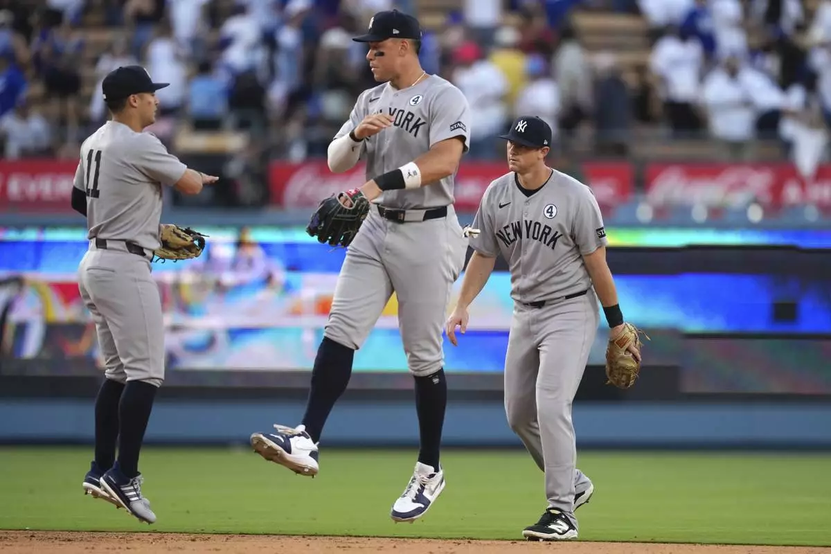New York Yankees' Aaron Judge, center, celebrates with Anthony Volpe, left, and DJ LeMahieu after the Yankees defeated the Los Angeles Dodgers 7-3 in a baseball game Sunday, June 1, 2025, in Los Angeles. (AP Photo/Mark J. Terrill)