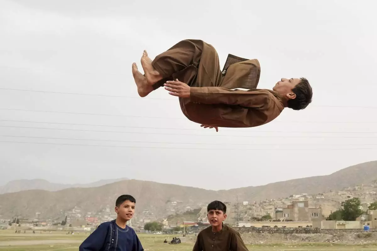 Children look as one of them jumps on a trampoline at a public park on the day of Eid al-Adha, or "Feast of the Sacrifice", in Kabul, Afghanistan, Saturday, June 7, 2025. (AP Photo/Ebrahim Noroozi)