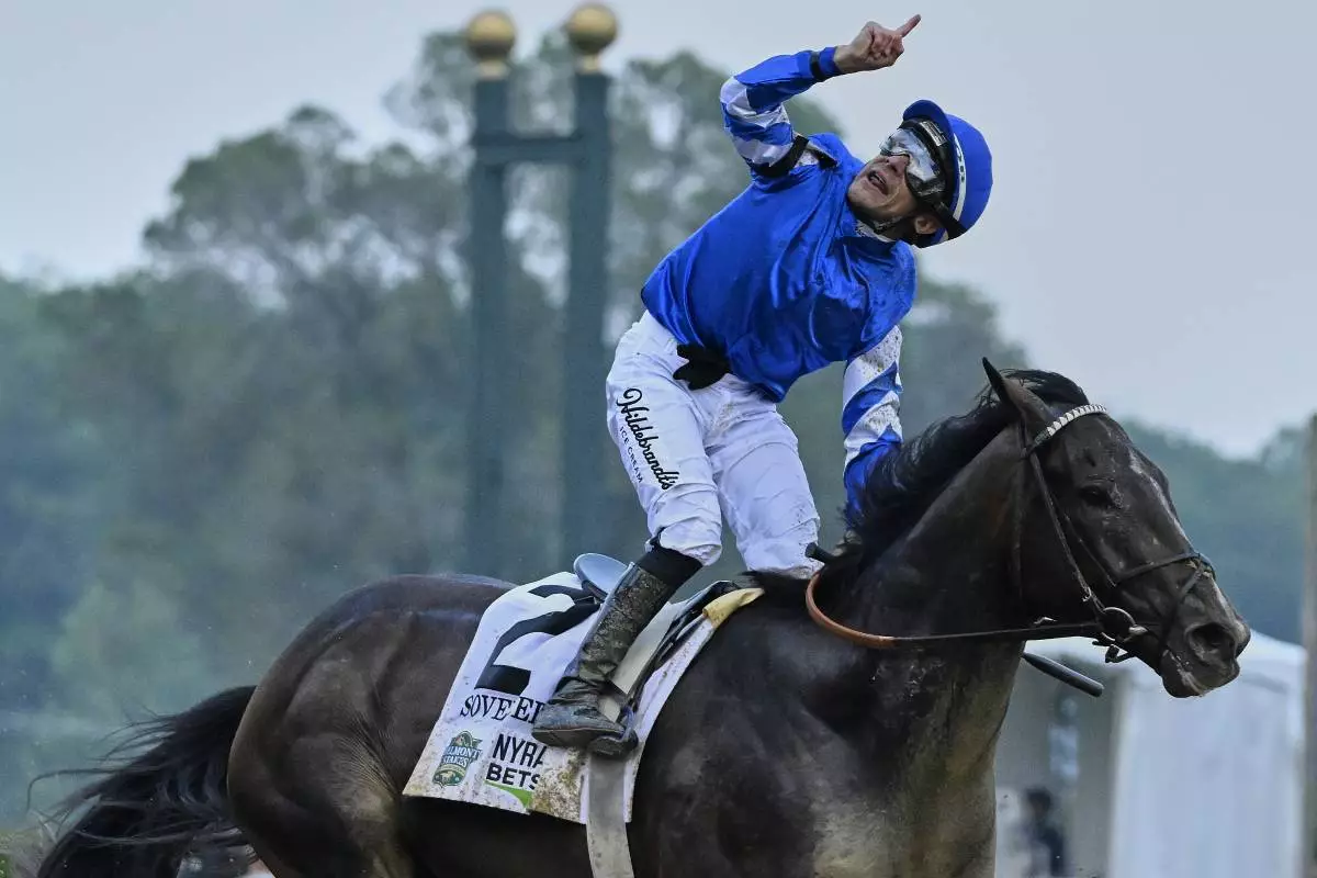 Jockey Junior Alvarado reacts aboard Sovereignty (2), after crossing the finish line to win the 157th running of the Belmont Stakes horse race, Saturday, June 7, 2025, in Saratoga Springs, N.Y. (AP Photo/Jessica Hill)