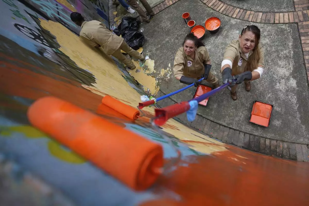 Inmates work on the recovery of a park as part of a new program helping prisoners reduce their sentences in Bogota, Colombia, Thursday, June 5, 2025. (AP Photo/Fernando Vergara)