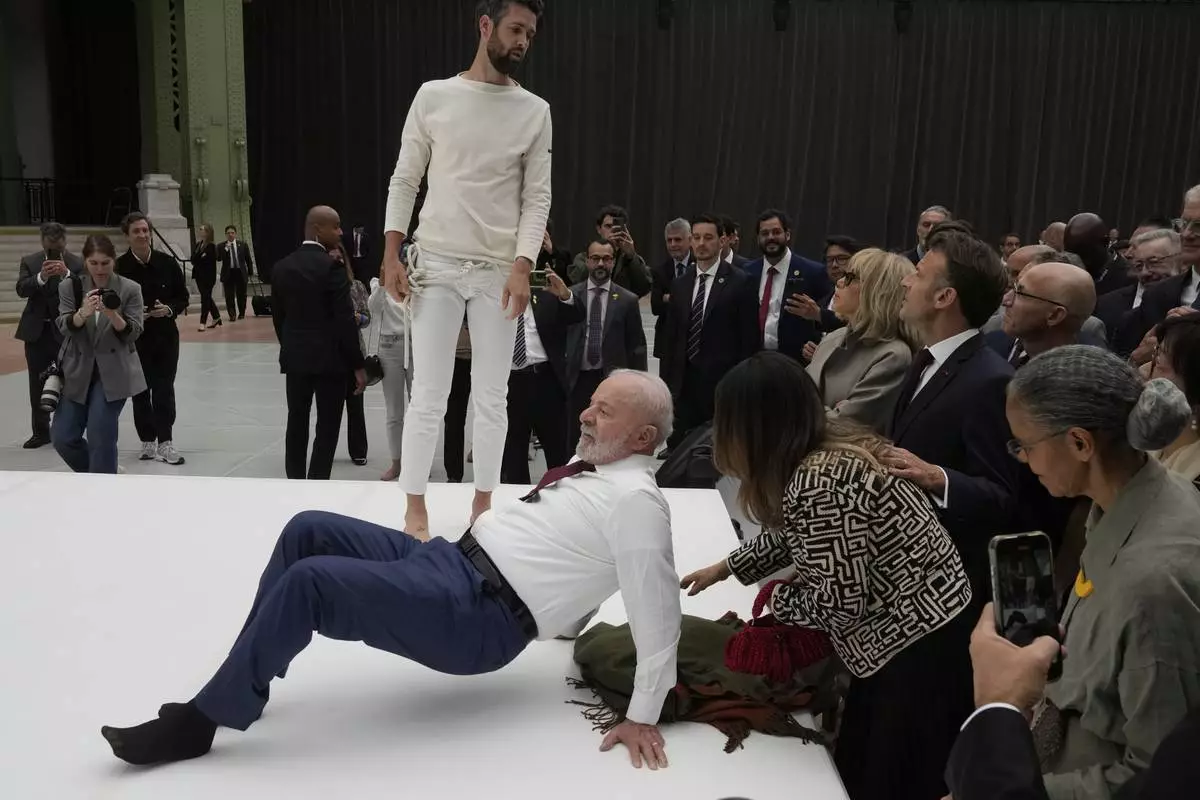 Brazil's President Luiz Inacio Lula da Silva tries to replicate a move by acrobats as part of a visit to an exhibition by Ernesto Neto Friday, June 6, 2025 at the Grand Palais museum in Paris. (AP Photo/Michel Euler, Pool)