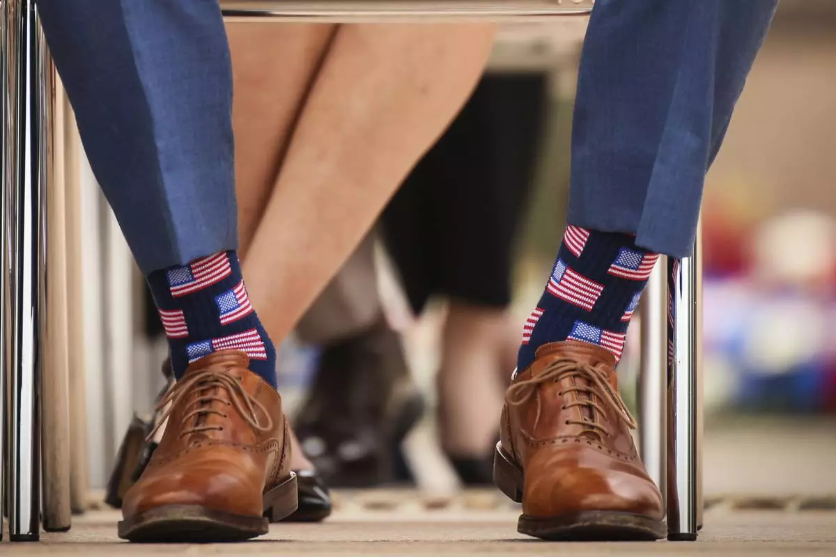 U.S. Defense Secretary Pete Hegseth wears socks showing the American flag during a ceremony at the US cemetery to commemorate the 81st anniversary of the D-Day landings, Friday, June 6, 2025 in Colleville-sur-Mer, Normandy. (AP Photo/Thomas Padilla)