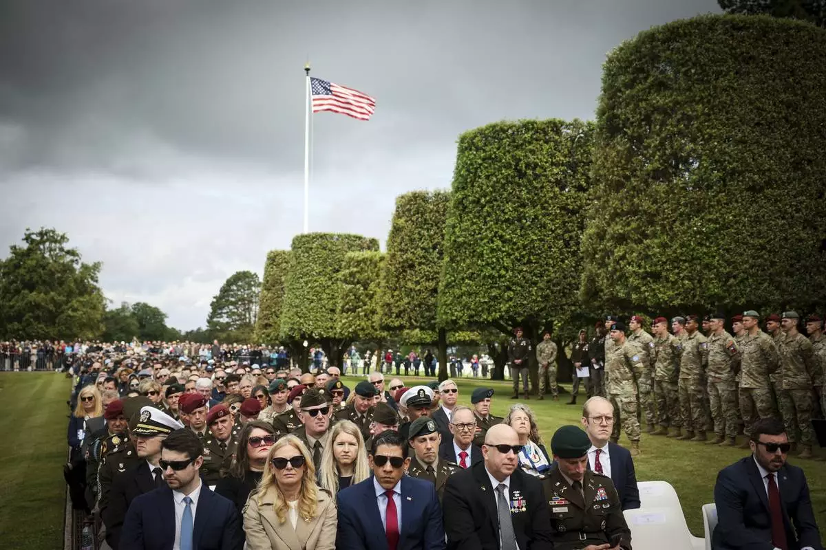Guests attend a ceremony at the US cemetery to commemorate the 81st anniversary of the D-Day landings, Friday, June 6, 2025 in Colleville-sur-Mer, Normandy. (AP Photo/Thomas Padilla)
