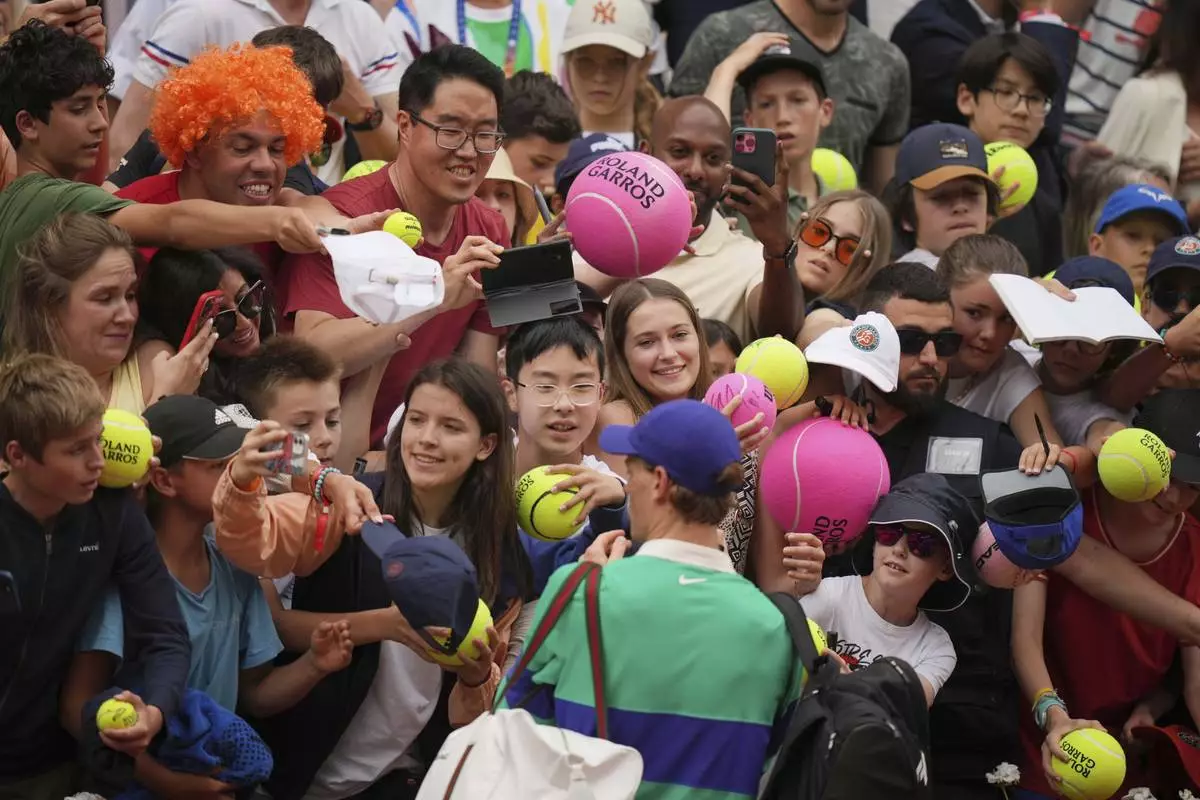 Italy's Jannik Sinner signs autographs to fans after beating Jiri Lehecka of the Czech Republic during their third round match of the French Tennis Open, at the Roland-Garros stadium, in Paris, Saturday, May 31, 2025. (AP Photo/Thibault Camus)
