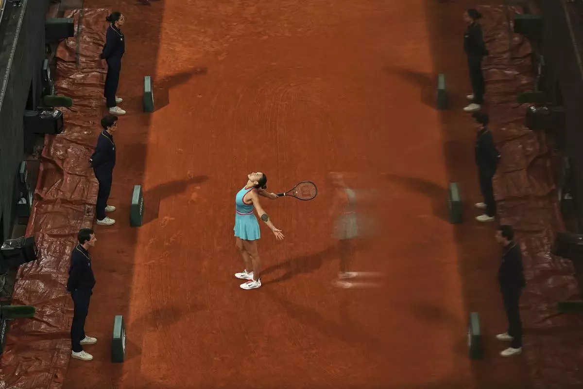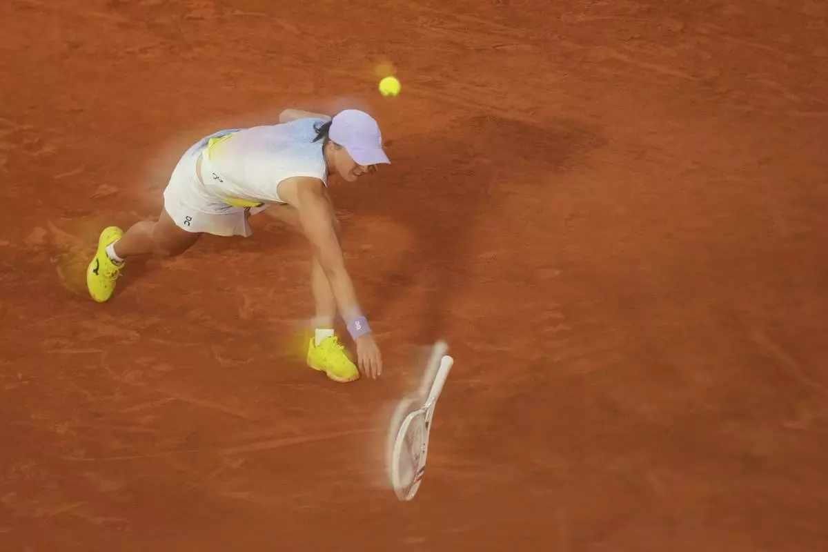 Poland's Iga Swiatek is reflected in a glass as she plays a shot against Aryna Sabalenka of Belarus during their semifinal match of the French Tennis Open at the Roland-Garros stadium in Paris, Thursday, June 5, 2025. (AP Photo/Aurelien Morissard)