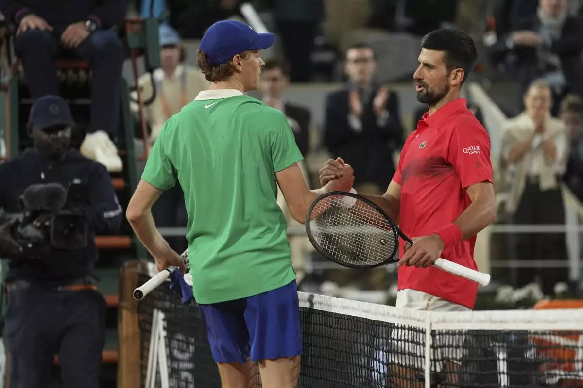 Winner Italy's Jannik Sinner, centre, and Serbia's Novak Djokovic shake hands after their semifinal match of the French Tennis Open at the Roland-Garros stadium in Paris, Friday, June 6, 2025.. (AP Photo/Thibault Camus)