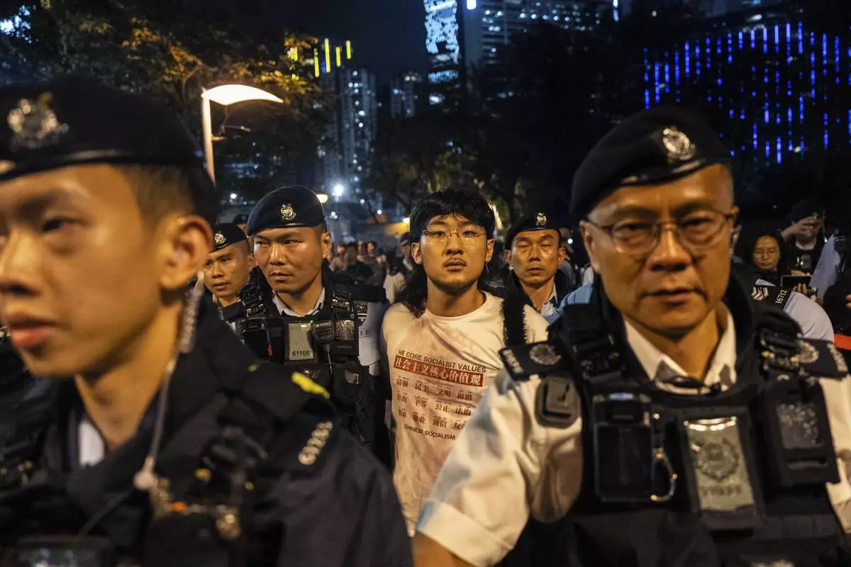 A man, center, is escorted by police officers at Victoria Park, the city's venue for the annual 1989 Tiananmen massacre vigil, on the 36th anniversary of China's Tiananmen Square crackdown, in Hong Kong, Wednesday, June 4, 2025. (AP Photo/Chan Long Hei)