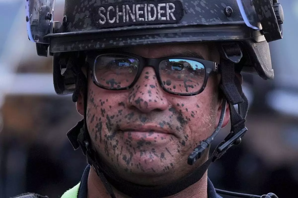 A police officer's face is covered in pepper spray outside the metropolitan detention center of downtown Los Angeles, Sunday, June 8, 2025, following last night's immigration raid protest. (AP Photo/Jae Hong)