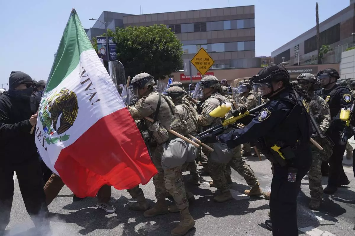 Protesters clash with authorities in downtown Los Angeles, Sunday, June 8, 2025, following last night's immigration raid protest. (AP Photo/Jae Hong)