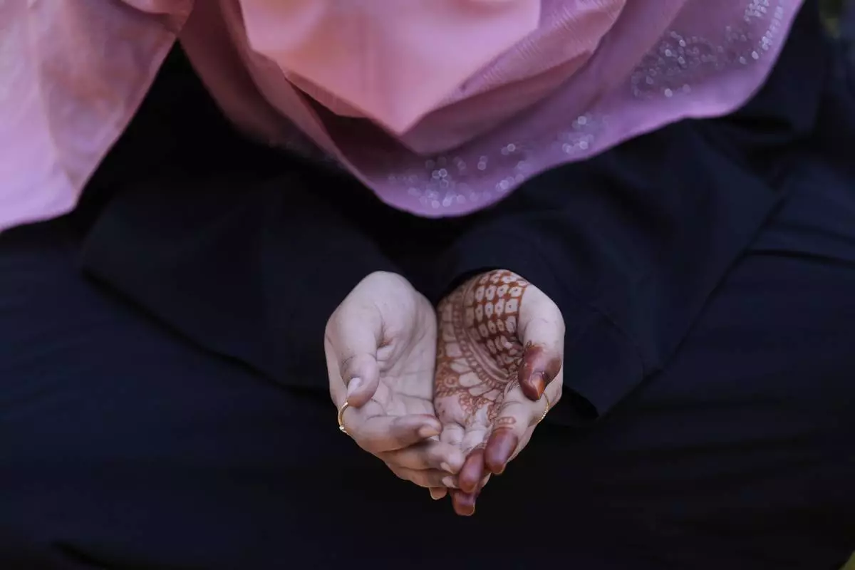 A Kashmiri Muslim woman, with hands decorated with henna, prays outside the shrine of Iranian scholar and Islamic saint Shah-e-Hamadan, on his death anniversary in Srinagar, Indian controlled Kashmir, India, Tuesday, June 3, 2025. (AP Photo/Dar Yasin)