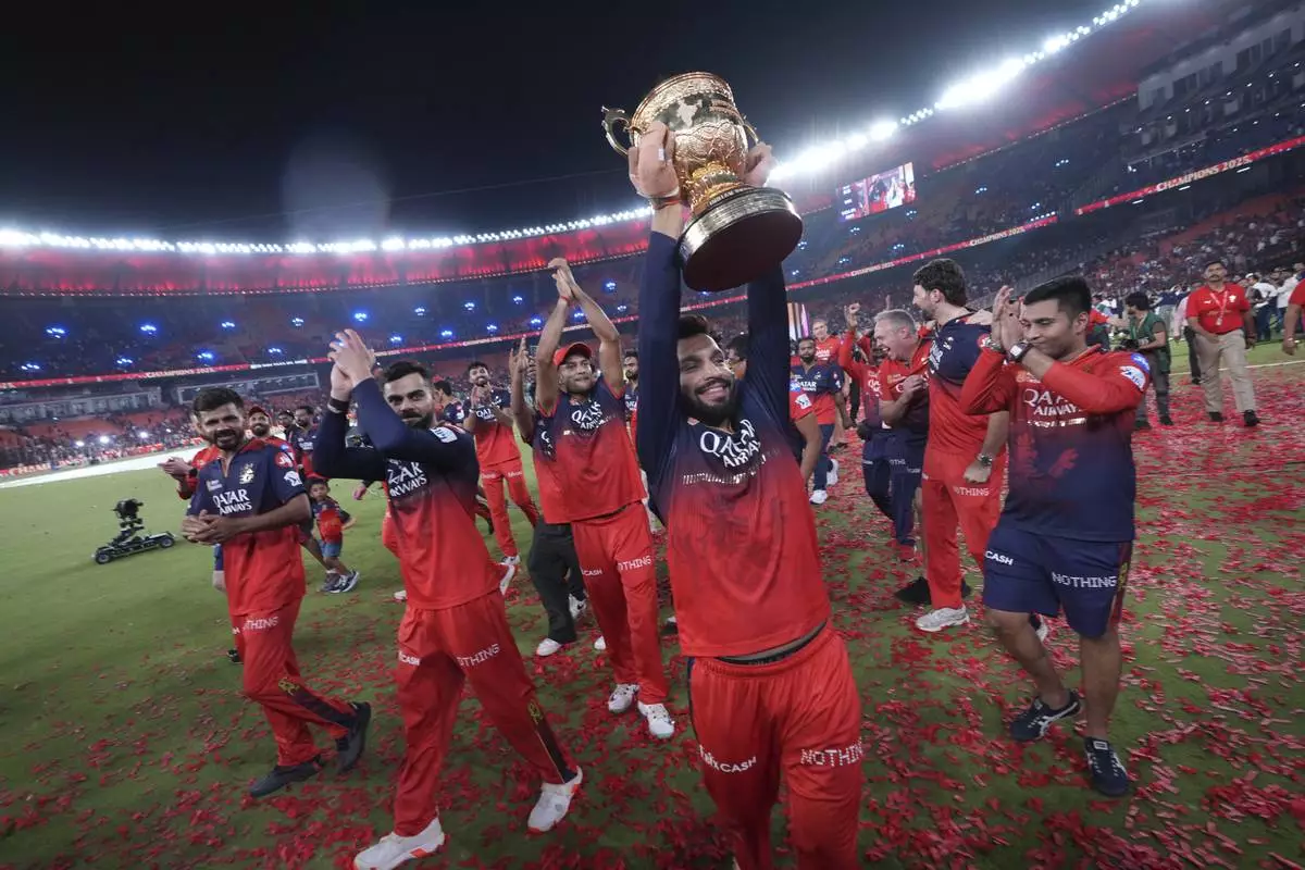 Royal Challengers Bengaluru's captain Rajat Patidar celebrates with the winners trophy after their win in the Indian Premier League final cricket match against Punjab Kings at Narendra Modi Stadium in Ahmedabad, India, Wednesday, June 4, 2025. (AP Photo/Ajit Solanki)