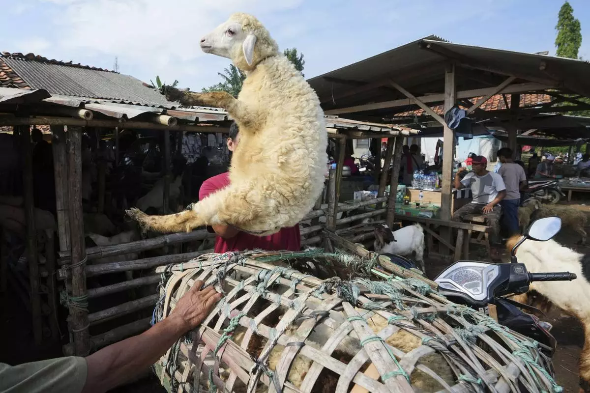 A man lifts a sheep for sale ahead of Eid al-Adha holiday at a livestock market in Jonggol, West Java, Indonesia, Monday, June 2, 2025. (AP Photo/Achmad Ibrahim)