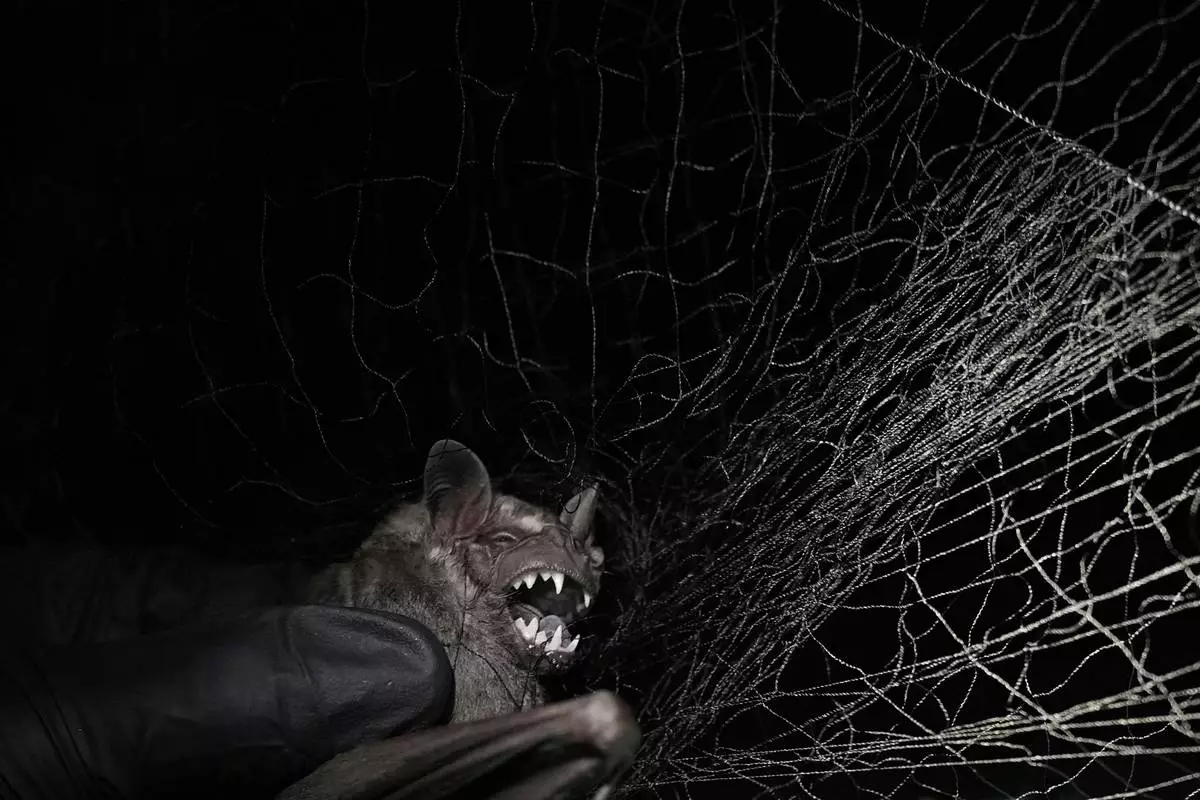 A scientist from the Smithsonian Tropical Research Institute captures a bat for research in Gamboa, Panama, Sunday, June 1, 2025. (AP Photo/Matias Delacroix)