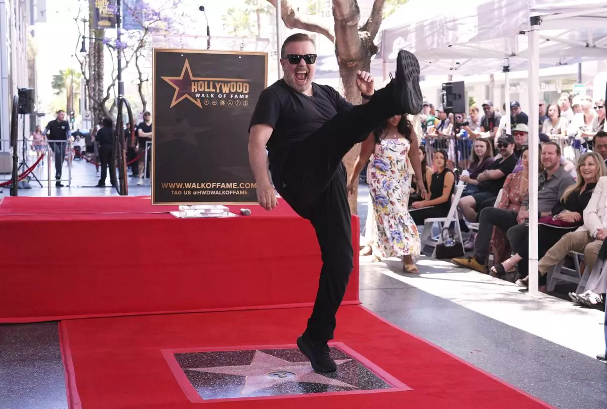 Comedian Ricky Gervais celebrates with a kick at a ceremony honoring him with a star on the Hollywood Walk of Fame on Friday, May 30, 2025, in Los Angeles. (AP Photo/Chris Pizzello)