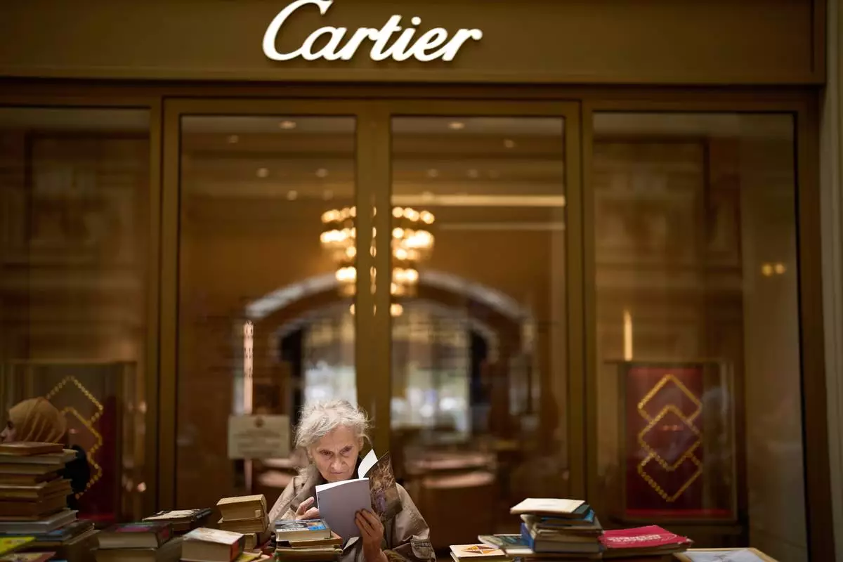 A woman reads a book while standing at a book shop next to a Cartier boutique, that was closed due to sanctions, at the GUM Department store during the annual Red Square Book Festival, celebrating Alexander Pushkin's birthday with days of free concerts, readings, lectures and kids' events in Red Square in Moscow, Russia, Wednesday, June 4, 2025. (AP Photo/Alexander Zemlianichenko)
