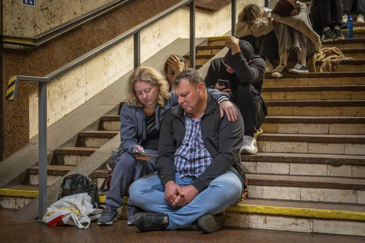 People rest in a metro station, being used as a bomb shelter, during a Russian drones attack in Kyiv, Ukraine, early Friday, June 6, 2025. (AP Photo/Dan Bashakov)
