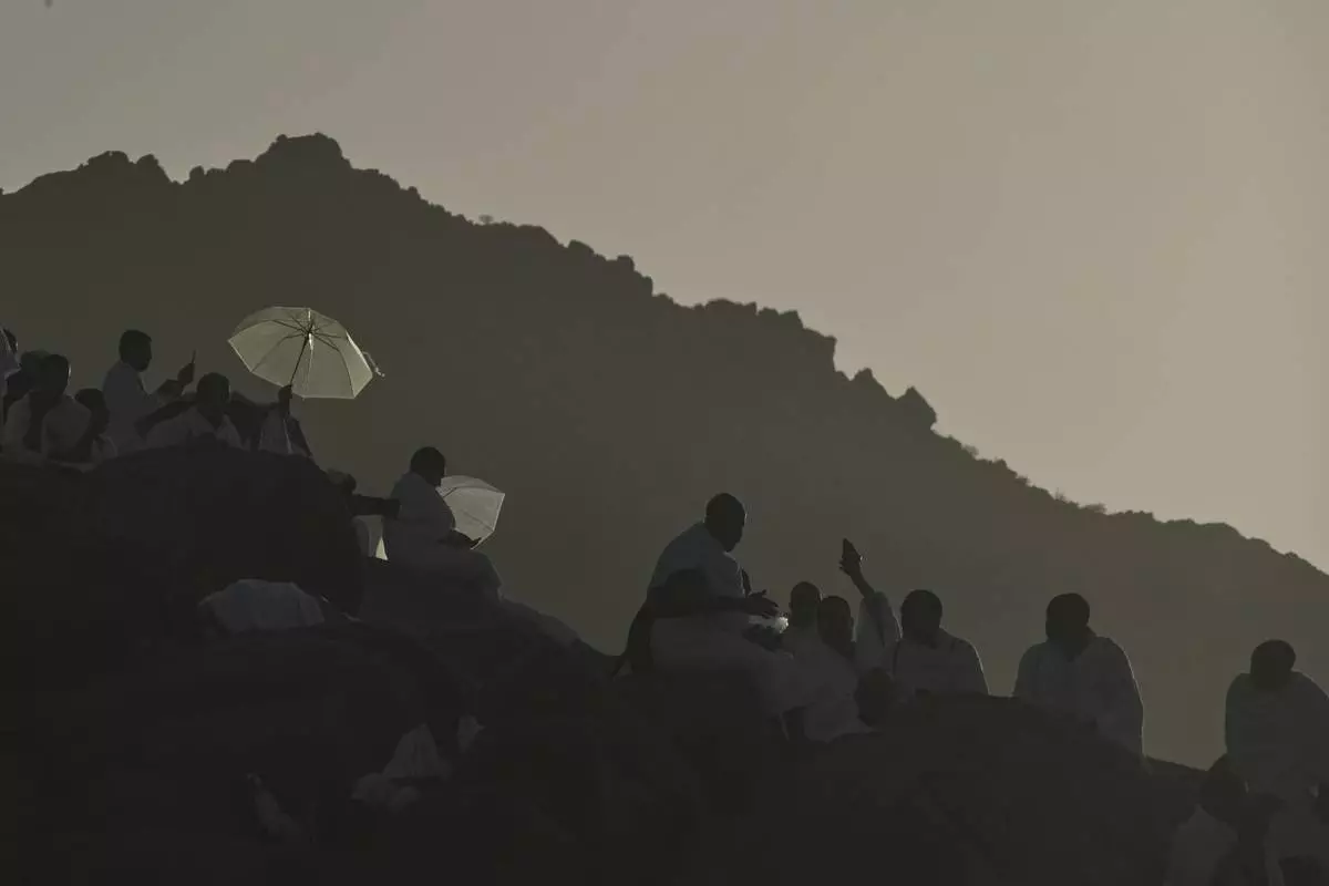 Muslim pilgrims gather a top of the rocky hill known as the Mountain of Mercy, on the Plain of Arafat, during the annual Hajj pilgrimage near the holy city of Mecca, Saudi Arabia, Thursday, June 5, 2025. (AP Photo/Amr Nabil)