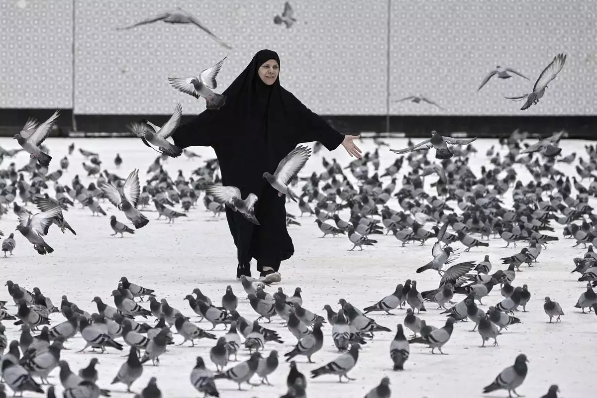 A Muslim pilgrim plays with pigeons outside the Grand Mosque during the annual hajj pilgrimage in Mecca, Saudi Arabia, Tuesday, June 3, 2025. (AP Photo/Amr Nabil)