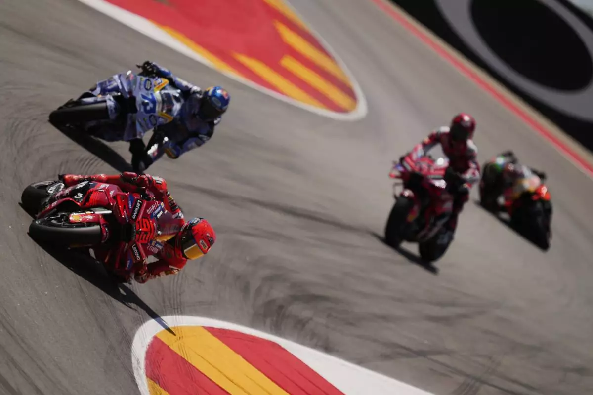Spain's rider Marc Marquez of the Ducati Lenovo Team steers his motorcycle followed by Spain's rider Alex Marquez of the BK8 Gresini Racing MotoGP AND Italian rider Francesco Bagnaia of the Ducati Lenovo Team during the MotoGP race of the Grand Prix of Aragon at the MotorLand Aragon circuit, in Alcaniz, Spain, Sunday, June 8, 2025. (AP Photo/Jose Breton)